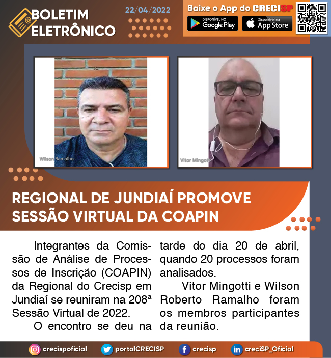 Integrantes da Comissão de Análise de Processos de Inscrição (COAPIN) da Regional do Crecisp em Jundiaí se reuniram na 208ª Sessão Virtual de 2022.