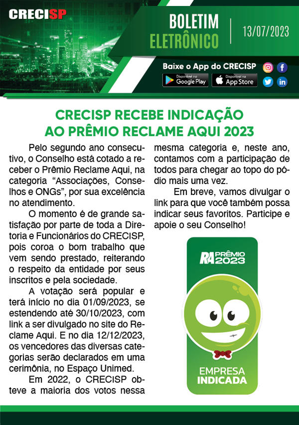 CRECISP recebe indicação ao Prêmio Reclame Aqui