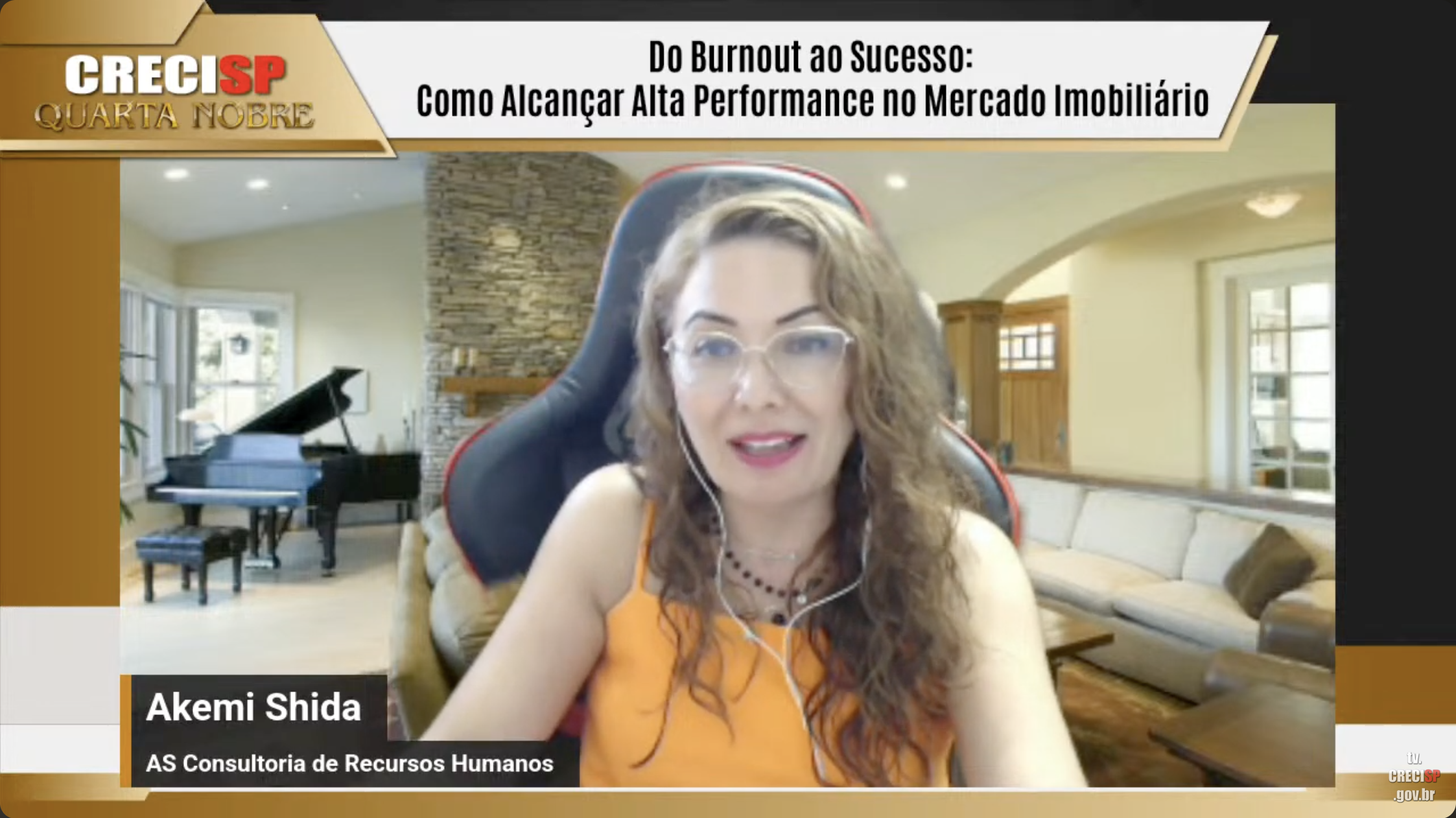 No dia 5 de março, a psicóloga especialista em Liderança, Planejamento de Carreira, Desenvolvimento Humano e Organizacional, Akemi Shida, ministrou uma palestra online na Quarta Nobre do CRECISP com um tema essencial para os profissionais do setor imobiliário: Do Burnout ao Sucesso: Como Alcançar Alta Performance no Mercado Imobiliário.