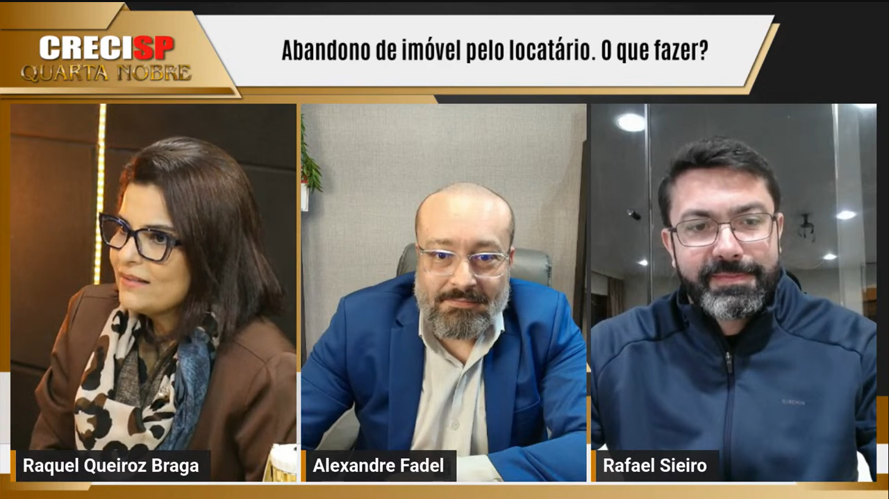 No dia 23 de julho, o tema “Abandono de Imóvel pelo Locatário: o que fazer?” foi debatido em palestra online realizada durante a Quarta Nobre, com a participação de três especialistas: Rafael Sieiro, especialista em locações e professor na Unicreci do Rio de Janeiro; Alexandre Fadel, advogado e corretor de imóveis; e Raquel Costa Queiroz Braga, advogada com duas pós-graduações nas áreas cível e imobiliária.