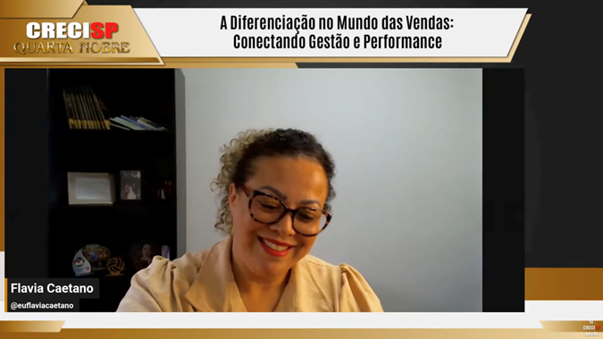 No dia 29 de janeiro, a especialista em gestão e vendas, Flávia Caetano, ministrou uma palestra online na Quarta Nobre do CRECISP, abordando o tema "A Diferenciação no Mundo das Vendas: Conectando Gestão e Performance". Durante o evento, a palestrante destacou como a verdadeira diferenciação no mercado de vendas não se restringe apenas às estratégias de mercado, mas à combinação entre uma gestão eficiente e a busca contínua por alto desempenho.