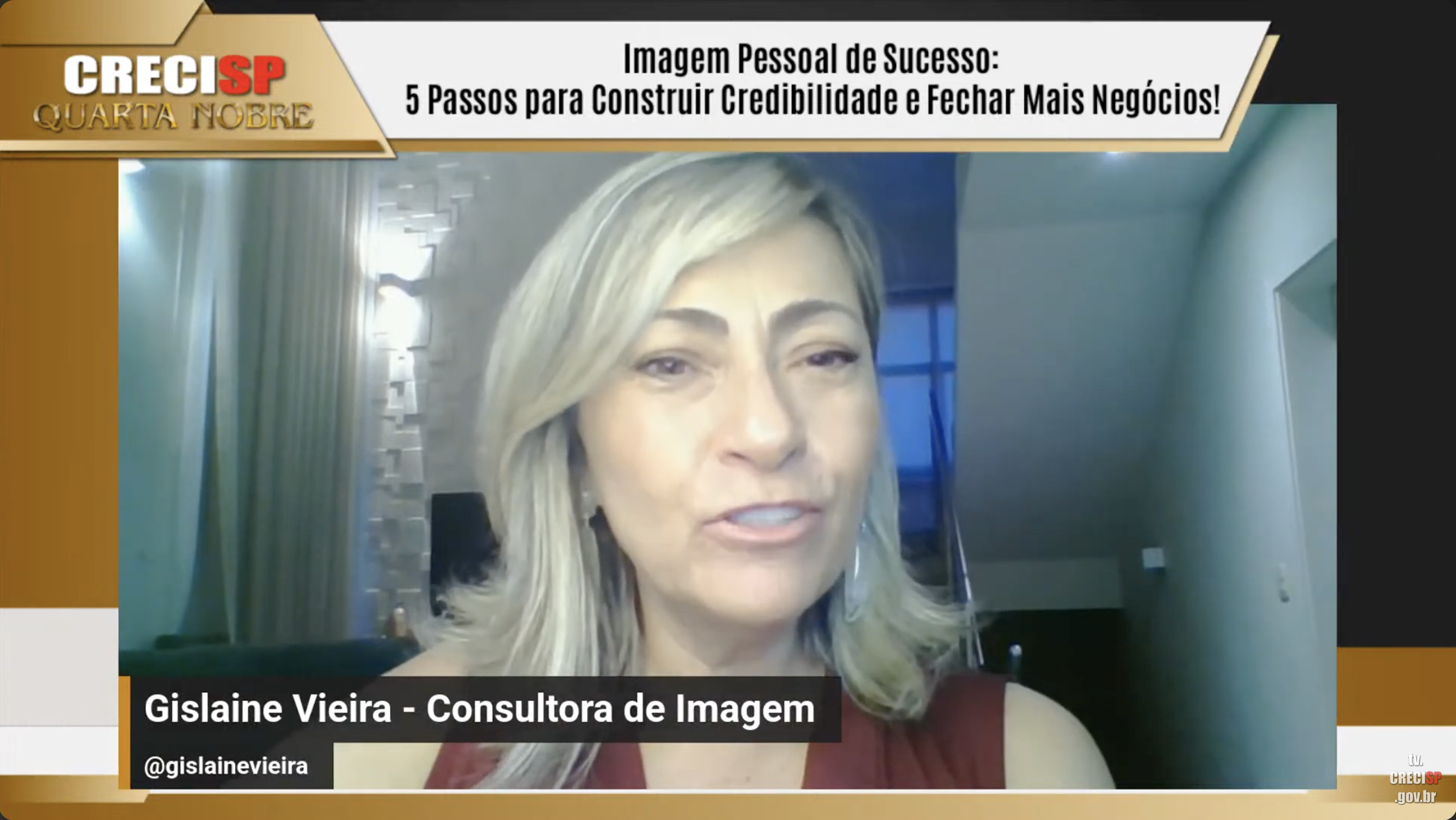No dia 9 de abril, o CRECISP promoveu mais uma edição da Quarta Nobre, desta vez com a participação da consultora de imagem Gislaine Vieira, que ministrou a palestra online intitulada “Imagem Pessoal de Sucesso: 5 Passos para Construir Credibilidade e Fechar Mais Negócios”.