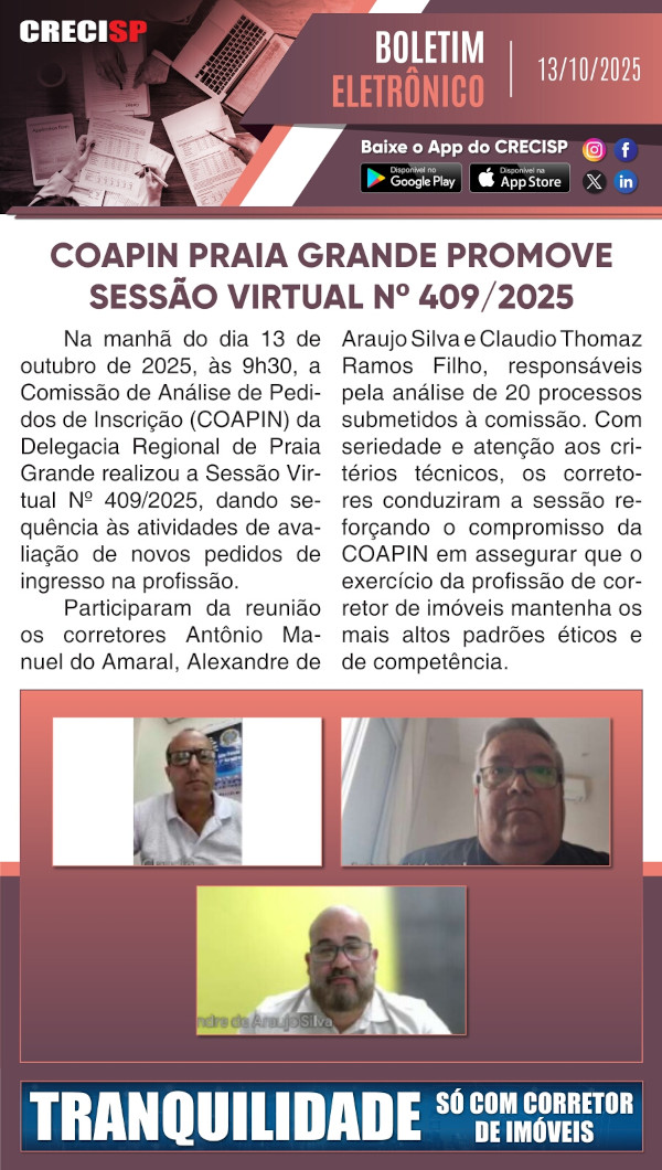 COAPIN Praia Grande promove sessão virtual Nº 409/2025