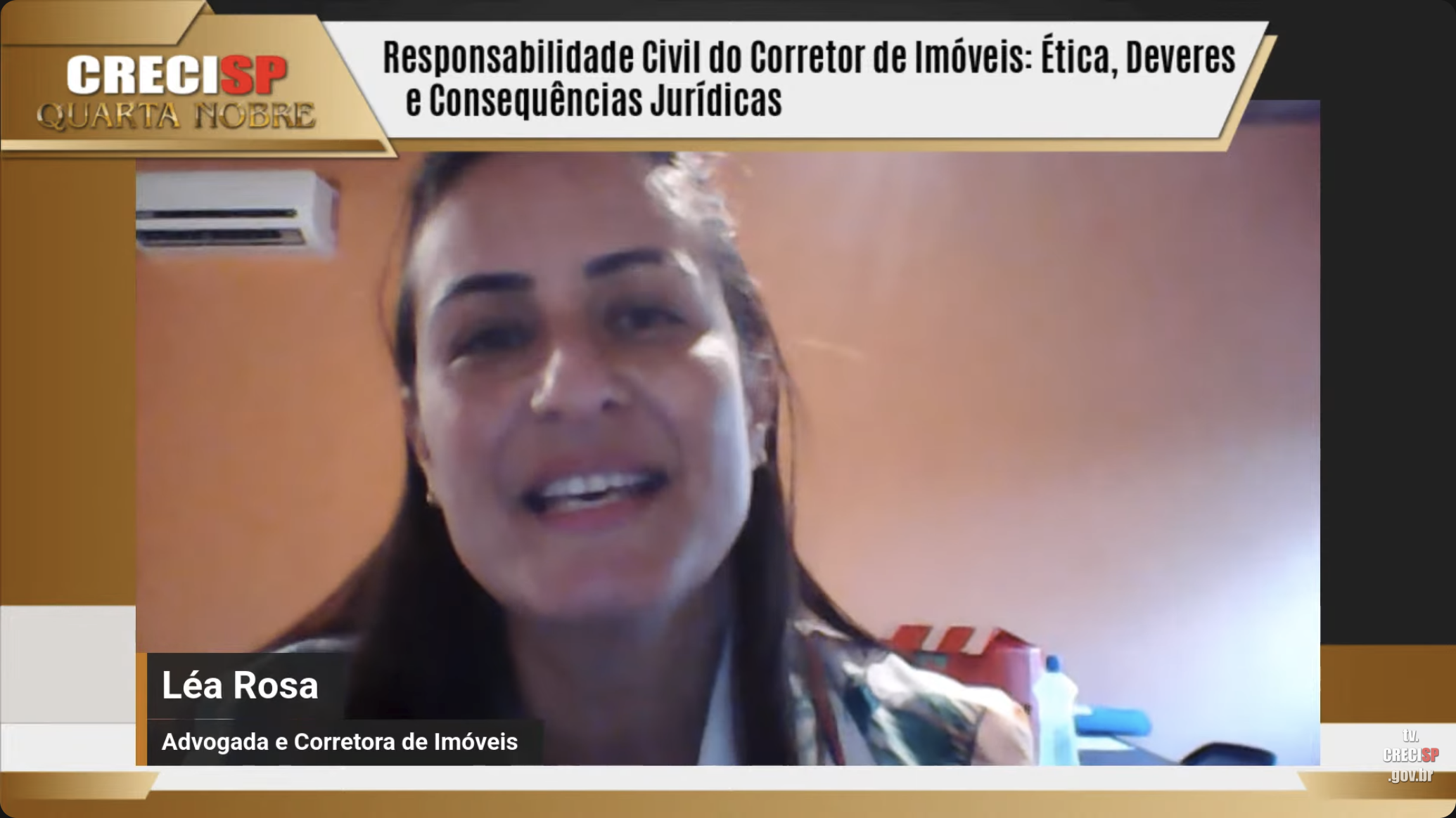 No dia 19 de novembro, a corretora de imóveis e advogada Léa Rosa ministrou uma palestra online na Quarta Nobre abordando o tema “Responsabilidade Civil do Corretor de Imóveis: Ética, Deveres e Consequências Jurídicas”. A especialista destacou que o papel do corretor vai muito além da intermediação de negócios, envolvendo ética, transparência e o cumprimento rigoroso dos deveres legais.
