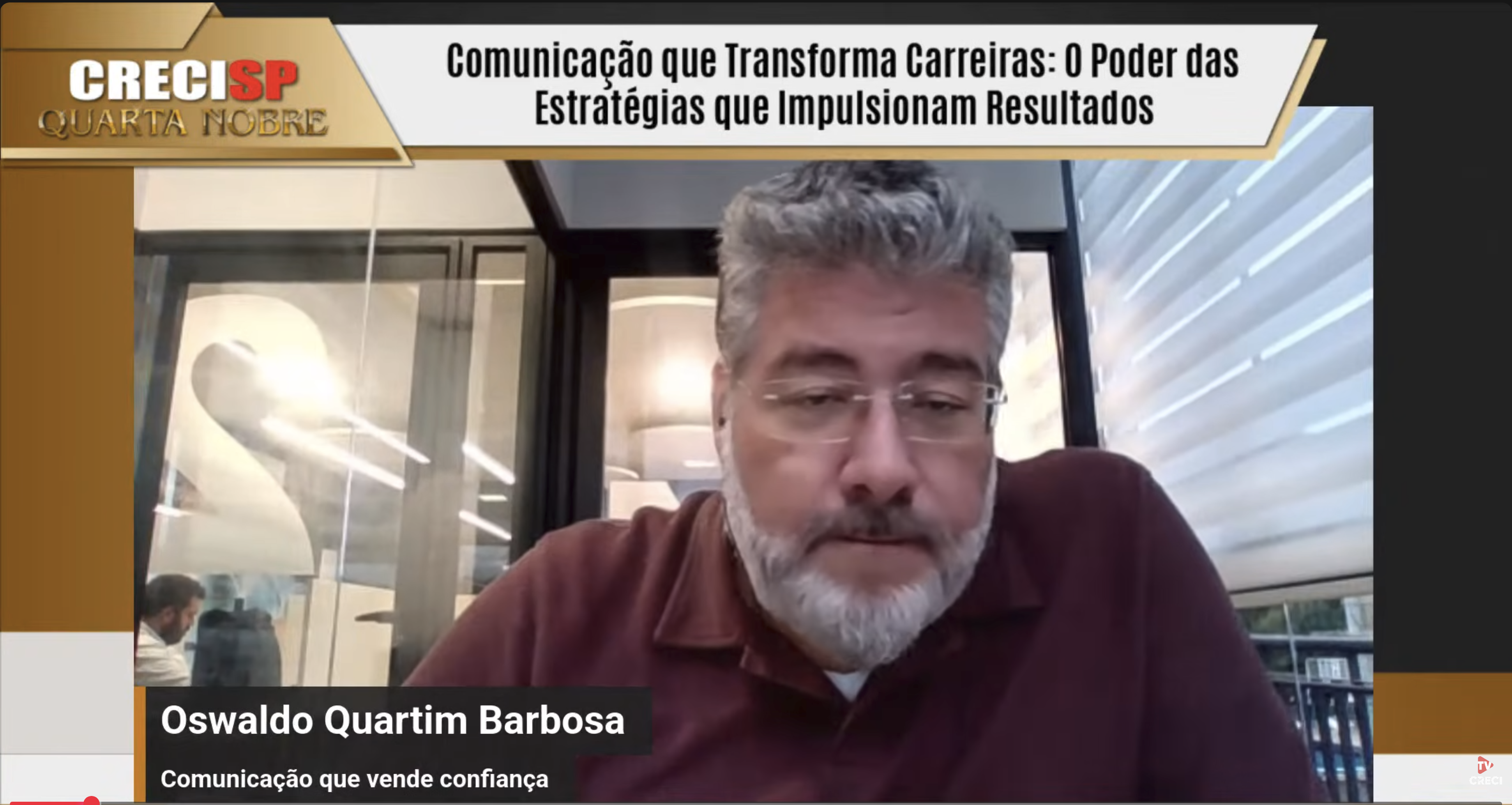 No dia 4 de fevereiro, a Quarta Nobre do CRECISP promoveu uma palestra online voltada a corretores de imóveis, com o jornalista José Oswaldo Quartim Barbosa. O encontro teve como tema “Comunicação que Transforma Carreiras: o poder das estratégias que impulsionam resultados” e abordou o papel da comunicação na atuação profissional.