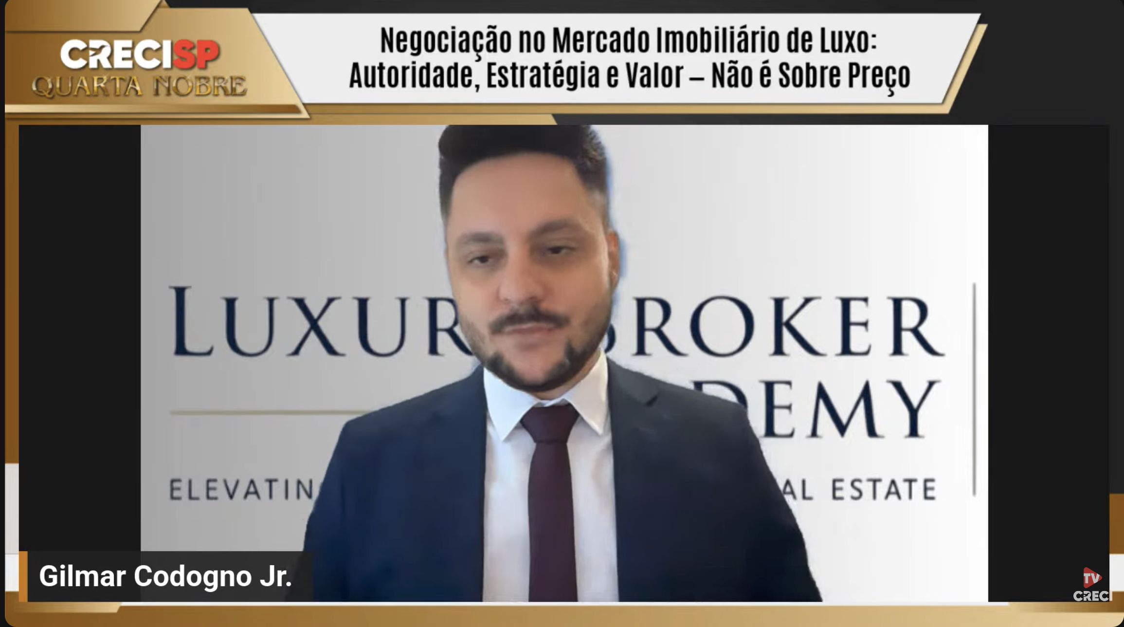 No dia 8 de abril, o especialista em imóveis de alto padrão Gilmar Codogno Jr ministrou a palestra “Negociação no Mercado Imobiliário de Luxo: Autoridade, Estratégia e Valor — Não é Sobre Preço” durante a Quarta Nobre do CRECISP.