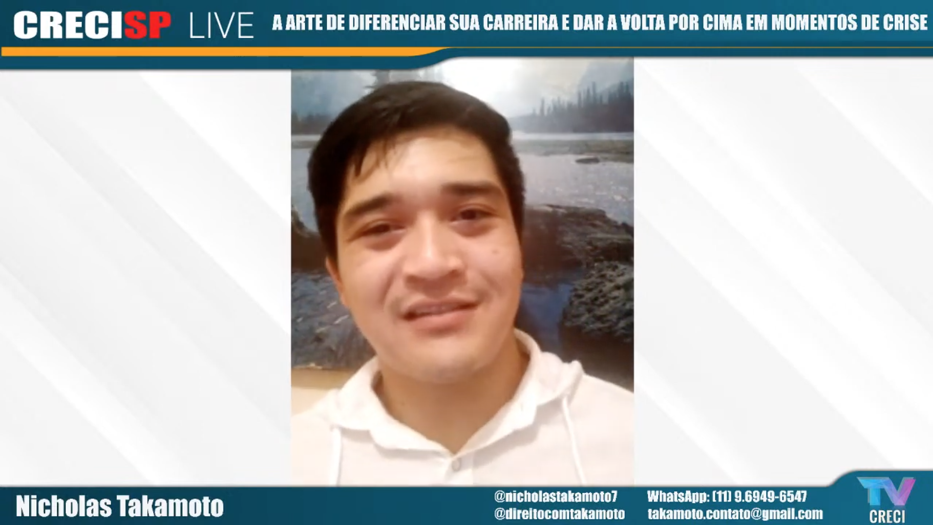 O corretor de imóveis e advogado, Nicholas Takamoto ministrou palestra on line, na Quarta Nobre e falou sobre o tema: A ARTE DE DIFERENCIAR SUA CARREIRA E DAR A VOLTA POR CIMA EM MOMENTOS DE CRISE